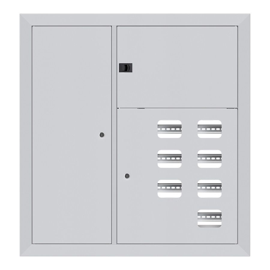 ID: 220Накладка щита этажного ЩЭ-8 на 8 квартир (счетчиков) 2-дверный со слаботочным отсеком слева (1000x950x30) IP31 УХЛ3 из стали серого цвета. Две двери с ревизионным окошком, замок. Защита IP31, климат УХЛ3, толщина 0,8 мм, 25 лет, 36 мес гарантии. Замена фасада обеспечивает скорость, сбережения, непрерывность работы. Выгоды: монтаж без отключения, экономия на фасаде, подгонка ниш, аккуратный вид маскирует износ, барьер вмешательству, опции дизайна, долговечность покрытия, совместимость с ремонтами, удобство эксплуатации, безопасность оборудования.